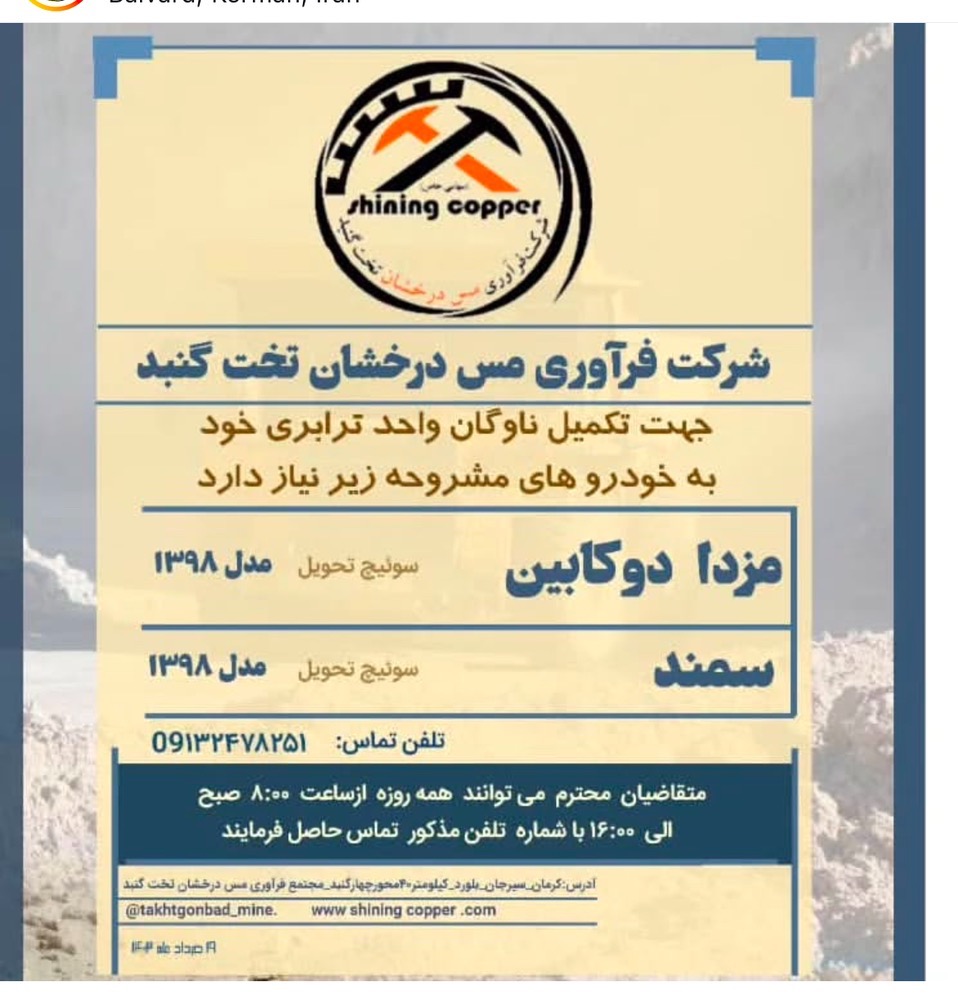 آگهی بکارگیری خودرو در شرکت مس درخشان تخت گنبد سیرجان منتشر شد