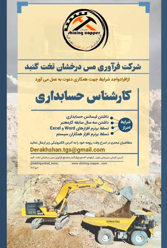 آگهی جذب کارشناس حسابداری در شرکت فرآوری مس درخشان تخت گنبد منتشر شد